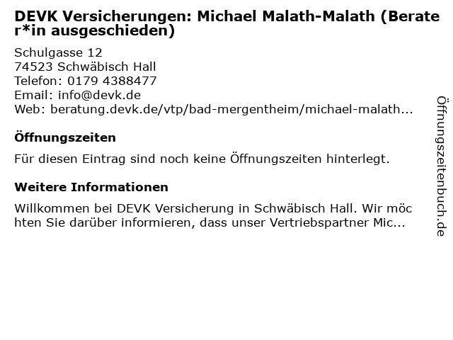 | DEVK Versicherungen: Michael Malath-Malath (Berater*in ausgeschieden) anrufen | |