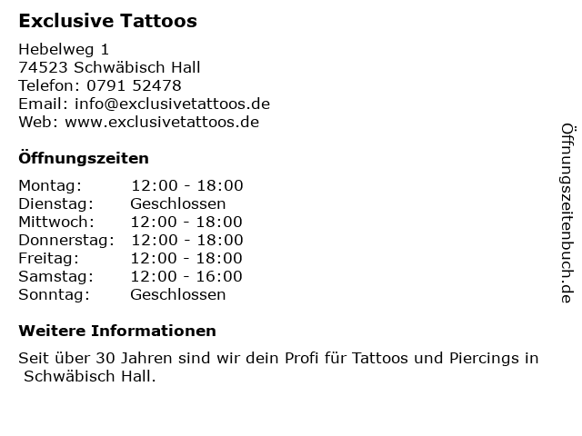 | Öffnungszeiten Exclusive Tattoos in Schwäbisch Hall anzeigen | |