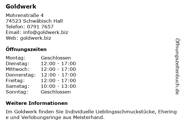 | Öffnungszeiten Goldwerk in Schwäbisch Hall anzeigen | |