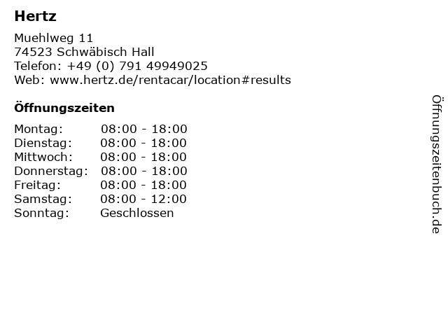 | Öffnungszeiten Hertz in Schwäbisch Hall anzeigen | |