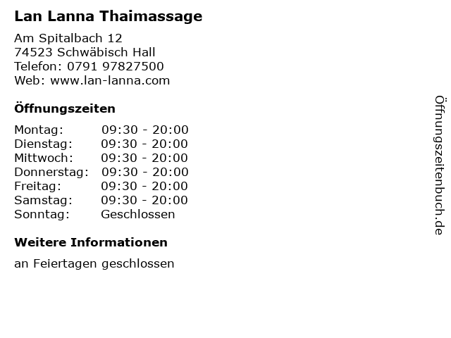 2 SAWASDEE KA, Traditionelle Thaimassage (Entfernung: 0,16 km) Gelbinger Gasse 10, 74523 Schwäbisch Hall 3 Lai Thai Praxis für Traditionelle Thaimassage (Entfernung: 0,33 km) Gelbinger Gasse 50, 74523 Schwäbisch Hall 6 |