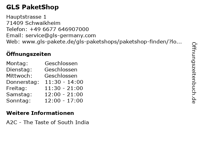 | Öffnungszeiten GLS PaketShop in Schwaikheim anzeigen | |