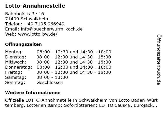 | Öffnungszeiten Lotto-Annahmestelle in Schwaikheim anzeigen | |