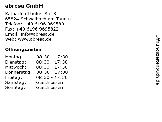 | Öffnungszeiten abresa GmbH in Schwalbach am Taunus anzeigen | |