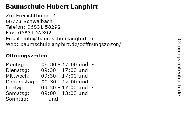 | Öffnungszeiten Baumschule Hubert Langhirt in Schwalbach anzeigen | |