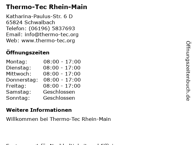| Öffnungszeiten Thermo-Tec Rhein-Main in Schwalbach anzeigen | |