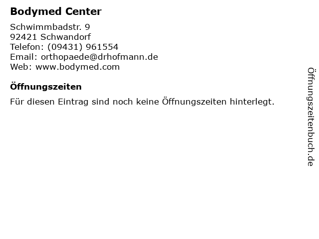| Öffnungszeiten Bodymed Center in Schwandorf anzeigen | |