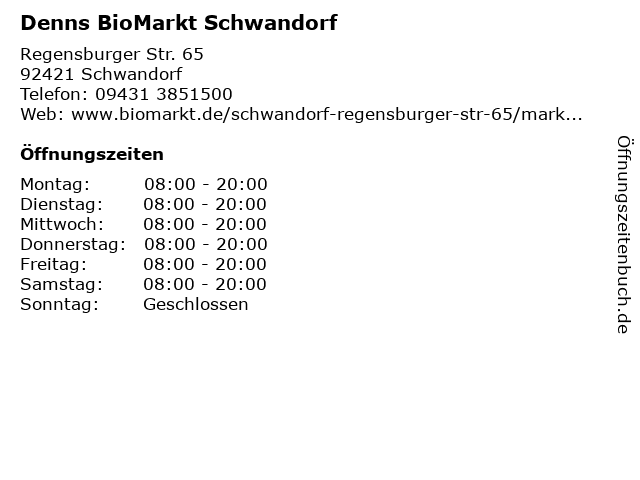 | Telefonnummer Denns BioMarkt Schwandorf in Schwandorf (09431 3851500) anrufen | |