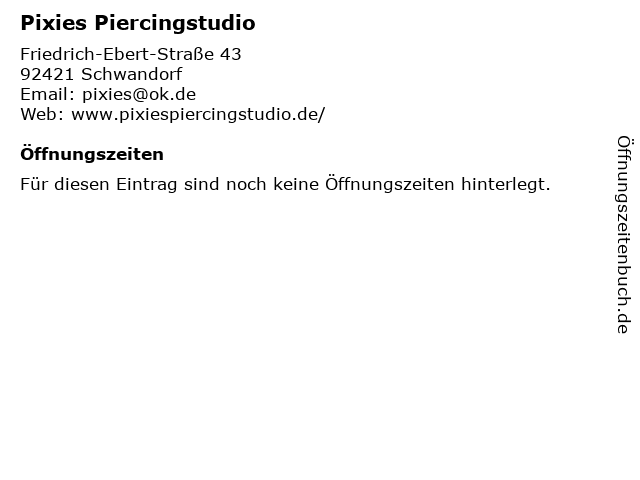 | Öffnungszeiten Pixies Piercingstudio in Schwandorf anzeigen | |