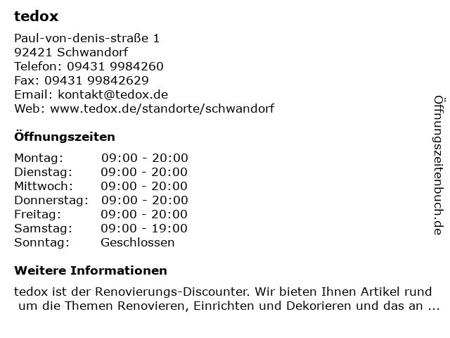| Öffnungszeiten tedox in Schwandorf anzeigen | |
