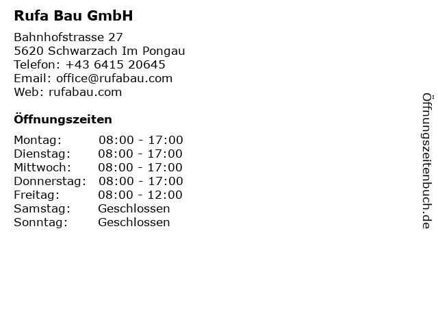 | Öffnungszeiten Rufa Bau GmbH in Schwarzach Im Pongau anzeigen | |