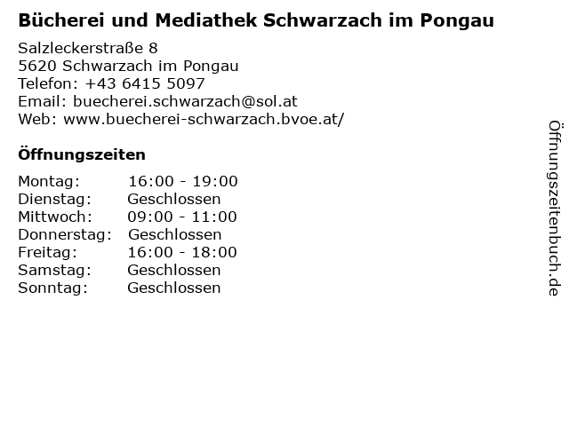 2 Bücherei der Marktgemeinde Schwarzach i. Pg. (Entfernung: 0,11 km) Dr. Franz-Hainstraße 2, 5620 Schwarzach Im Pongau 6 |