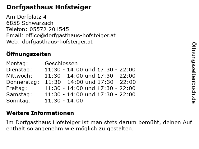 Öffnungszeiten Dorfgasthaus Hofsteiger in Schwarzach anzeigen | |