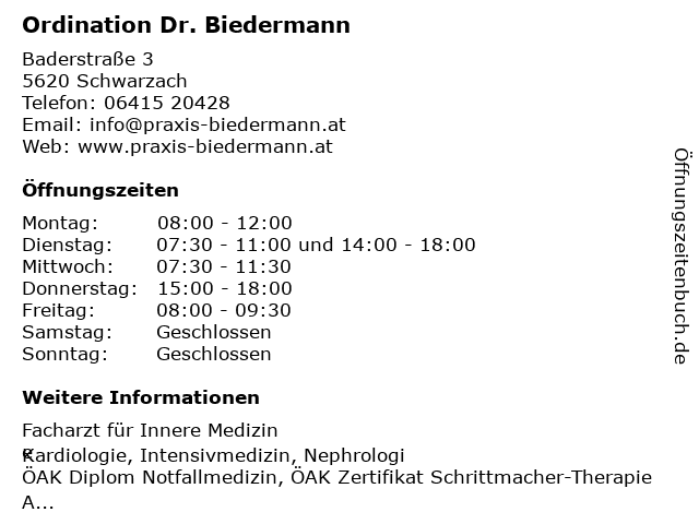| Öffnungszeiten Ordination Dr. Biedermann in Schwarzach anzeigen | |