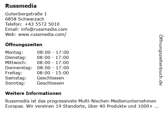 | Öffnungszeiten Russmedia in Schwarzach anzeigen | |