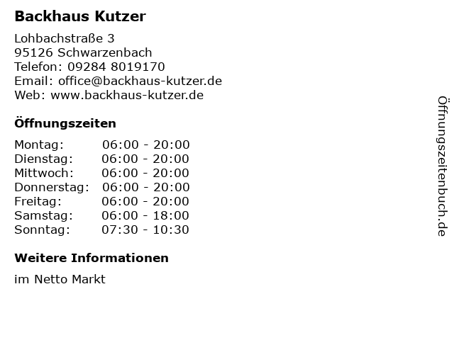 | Öffnungszeiten Backhaus Kutzer in Schwarzenbach anzeigen | |