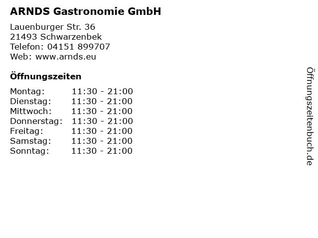 | Öffnungszeiten ARNDS Gastronomie GmbH in Schwarzenbek anzeigen | |