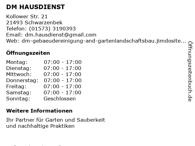 | Öffnungszeiten DM HAUSDIENST in Schwarzenbek anzeigen | |