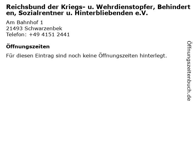 | Reichsbund der Kriegs- u. Wehrdienstopfer, Behinderten, Sozialrentner u. Hinterbliebenden e.V. anrufen | |
