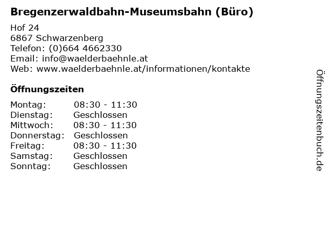 Branchen & Suchbegriffe zu Bregenzerwaldbahn-Museumsbahn (Büro):bregenzerwaldbahn, büro, ev, geschäft, geschäftsstelle, museumsbahn, verwaltung |
