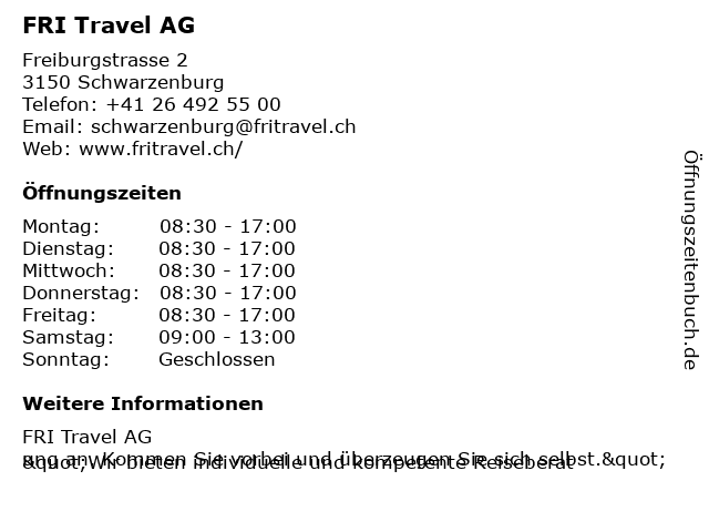 | Öffnungszeiten FRI Travel AG in Schwarzenburg anzeigen | |