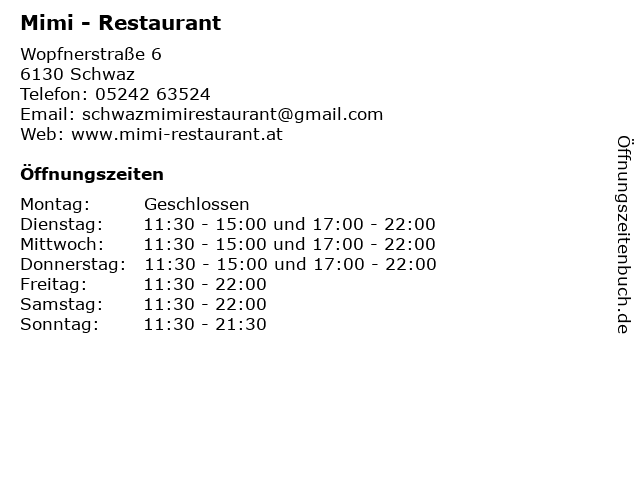 | Öffnungszeiten Mimi - Restaurant in Schwaz anzeigen | |