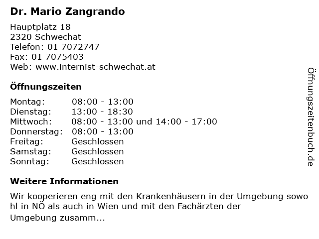 | Öffnungszeiten Dr. Mario Zangrando in Schwechat anzeigen | |