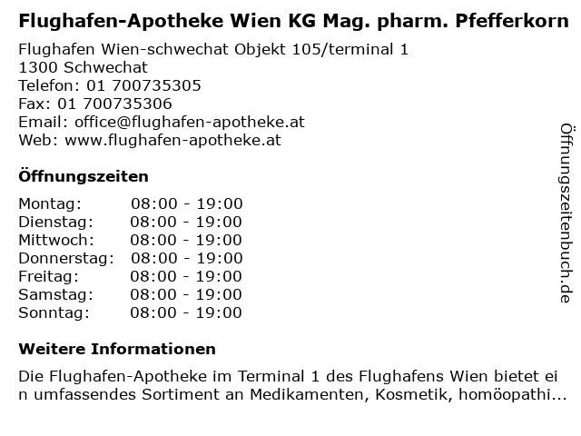 Branchen & Suchbegriffe zu Flughafen-Apotheke Wien KG Mag. pharm. Pfefferkorn:apotheke, flughafen, mag., pfefferkorn, pharm., wien |