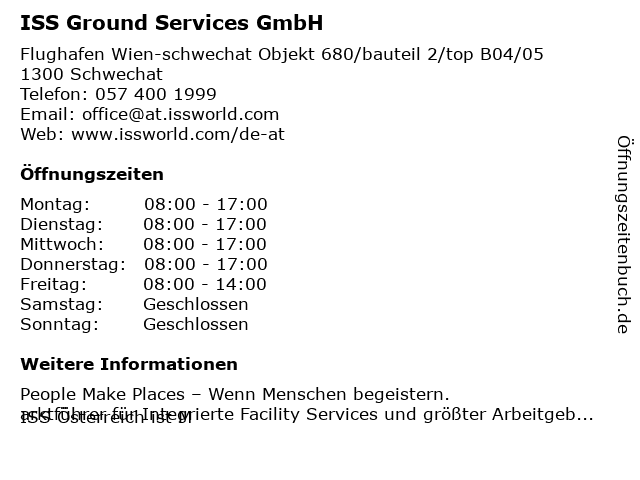 | Öffnungszeiten ISS Ground Services GmbH in Schwechat anzeigen | |