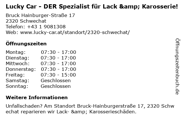 2 Lucky Car - DER Spezialist für Lack & Karosserie! (Entfernung: 10,24 km) Untere Viaduktgasse 6, 1030 Wien 3 Lucky Car - DER Spezialist für Lack & Karosserie! (Entfernung: 11,05 km) Hirschstettner Straße 44, 1220 Wien 4 Lucky Car - DER Spezialist für Lack & Karosserie! (Entfernung: 11,73 km) Konsumstraße 23, 2331 Vösendorf 5 Lucky Car - DER Spezialist für Lack & Karosserie! (Entfernung: 12,85 km) Breitenfurter Straße 143, 1120 Wien 6 Lucky Car - DER Spezialist für Lack & Karosserie! (Entfernung: 12,91 km) Altmannsdorfer Straße 30, 1120 Wien |