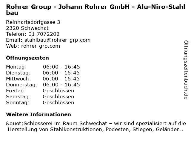 1 Alu-Niro-Stahlbau Schönberger GesmbHTochtergesellschaft (Entfernung: 0,01 km) Reinhartsdorfgasse 3, 2320 Rannersdorf 2 Rohrer Group - Johann Rohrer GmbH - Industriedienstleistungen (Entfernung: 0,16 km) Reinhartsdorfgasse 13, 2320 Schwechat 3 Rohrer Beteiligungs- und Verwaltungs GmbH (Entfernung: 0,16 km) Reinhartsdorfgasse 13, 2320 Rannersdorf 6 |