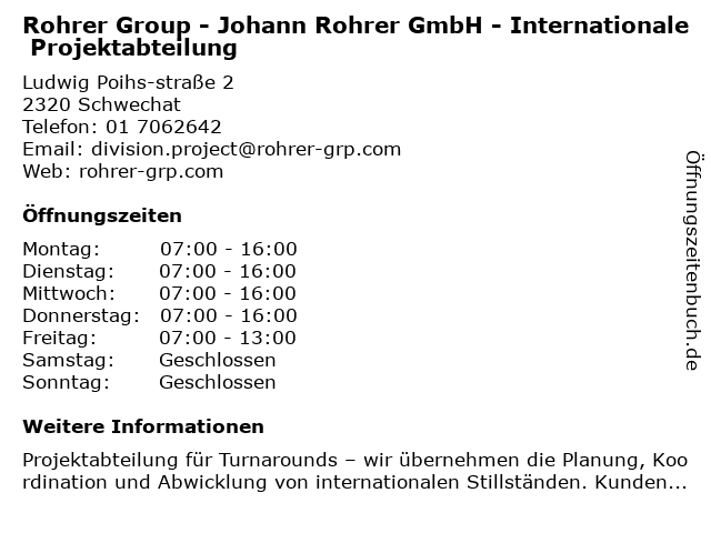 1 Rohrer Beteiligungs- und Verwaltungs GmbH (Entfernung: 0,01 km) Ludwig-Poihs-Straße 2, 2320 Schwechat 3 Rohrer Group - Johann Rohrer GmbH - Alu-Niro-Stahlbau (Entfernung: 3,89 km) Reinhartsdorfgasse 3, 2320 Schwechat 4 Rohrer Beteiligungs- und Verwaltungs GmbH (Entfernung: 3,95 km) Reinhartsdorfgasse 13, 2320 Rannersdorf 6 Rohrer Group - Johann Rohrer GmbH - Industriedienstleistungen (Entfernung: 3,96 km) Reinhartsdorfgasse 13, 2320 Schwechat |
