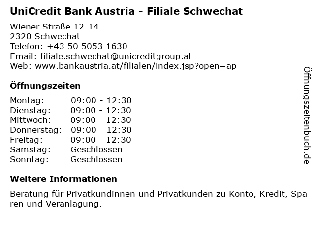Branchen & Suchbegriffe zu UniCredit Bank Austria - Filiale Schwechat:austria, bank, privatkundinnen und privatkunden, schwechat, unicredit |