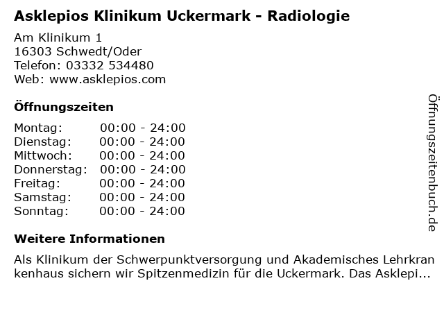 2 Asklepios Klinikum Uckermark - Hals-Nasen-Ohrenheilkunde - Closed (Entfernung: 0,00 km) Am Klinikum 1, 16303 Schwedt/Oder 4 Asklepios Klinikum Uckermark - Kinder- und Jugendmedizin (Entfernung: 0,02 km) Am Klinikum 1, 16303 Schwedt/Oder 5 Asklepios Klinikum Uckermark - Medizinisches Versorgungszentrum (Entfernung: 0,03 km) Am Klinikum 1, 16303 Schwedt/Oder 6 |