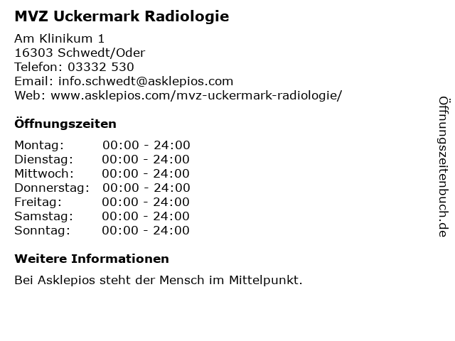 | Öffnungszeiten MVZ Uckermark Radiologie in Schwedt/Oder anzeigen | |