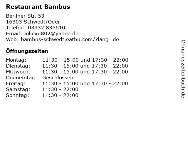 Öffnungszeiten Restaurant Bambus in Schwedt/Oder anzeigen