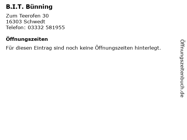 | Öffnungszeiten B.I.T. Bünning in Schwedt anzeigen | |