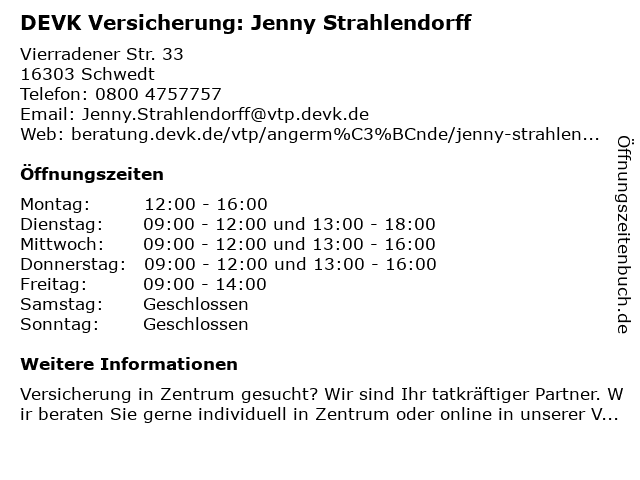 Branchen & Suchbegriffe zu DEVK Versicherung: Jenny Strahlendorff:altersvorsorge, autoversicherung, berufsunfähigkeitsversicherung, devk, gebäude- und hausratsversicherung, gewerbeversicherung, jenny, kfz-versicherung (motorrad), lebensversicherung, mietrechtsschutzversicherung, reiseversicherungsagentur, strahlendorff, versicherung |
