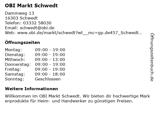 | Öffnungszeiten OBI Markt Schwedt in Schwedt anzeigen | |