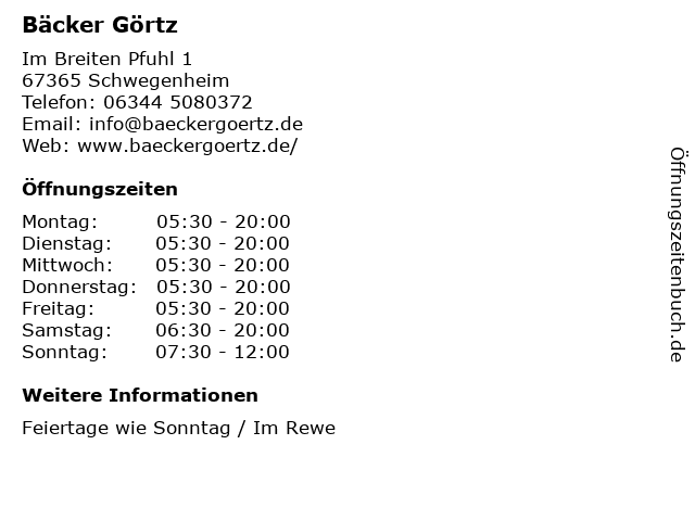 | Öffnungszeiten Bäcker Görtz in Schwegenheim anzeigen | |