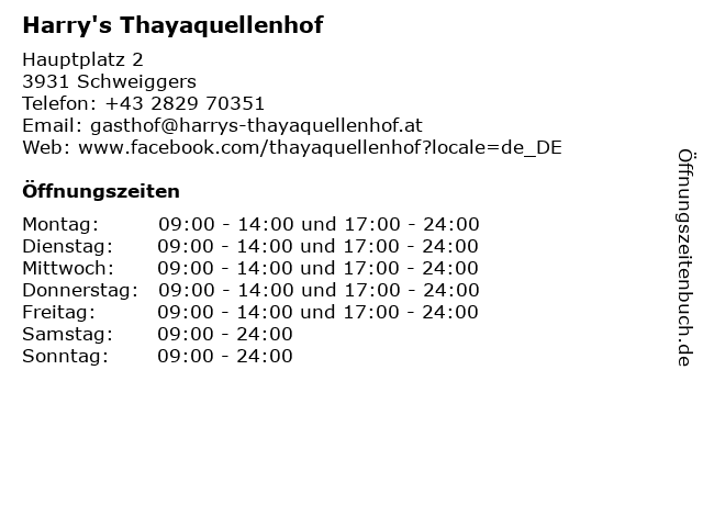 | Öffnungszeiten Harry's Thayaquellenhof in Schweiggers anzeigen | |