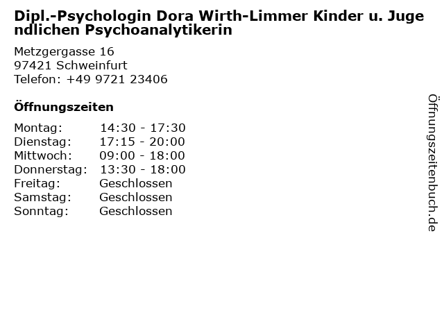 1 Dipl.-Psych. Erich Limmer Psychoanalytiker - Einzeltherapie u. Gruppen (Entfernung: 0,01 km) Metzgergasse 16, 97421 Schweinfurt 3 Alexander Wirth UG - Unfallinstandsetzung (Entfernung: 1,39 km) Heini-dittmar-str. 4, 97424 Schweinfurt 4 Michaela Wirth-Model Hausverwaltung (Entfernung: 1,44 km) Friedrich-Seyffert-Str. 10, 97422 Schweinfurt 6 |