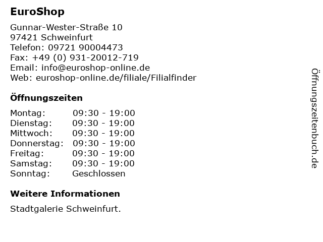 | Öffnungszeiten EuroShop in Schweinfurt anzeigen | |