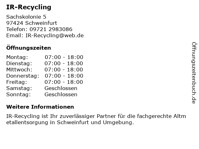 | Öffnungszeiten IR-Recycling in Schweinfurt anzeigen | |