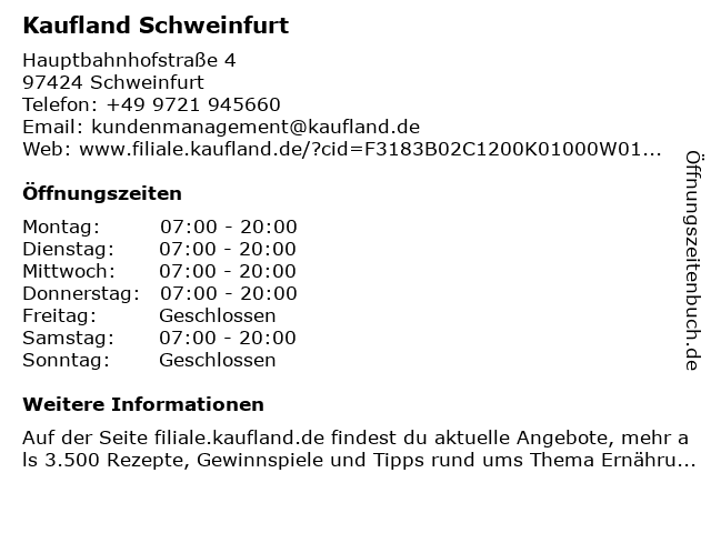 | Öffnungszeiten Kaufland Schweinfurt in Schweinfurt anzeigen | |