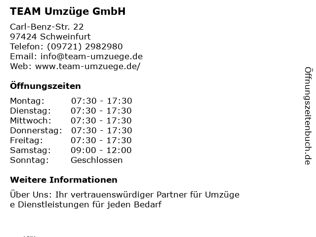 | Öffnungszeiten TEAM Umzüge GmbH in Schweinfurt anzeigen | |