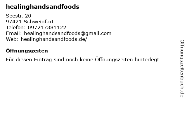 | Öffnungszeiten healinghandsandfoods in Schweinfurt anzeigen | |