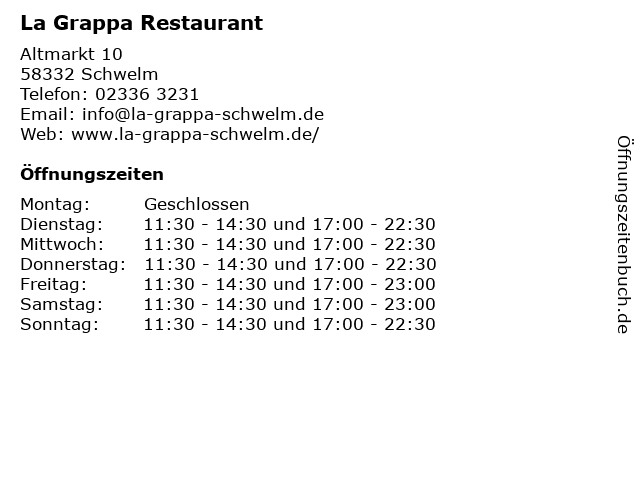 | Öffnungszeiten La Grappa Restaurant in Schwelm anzeigen | |