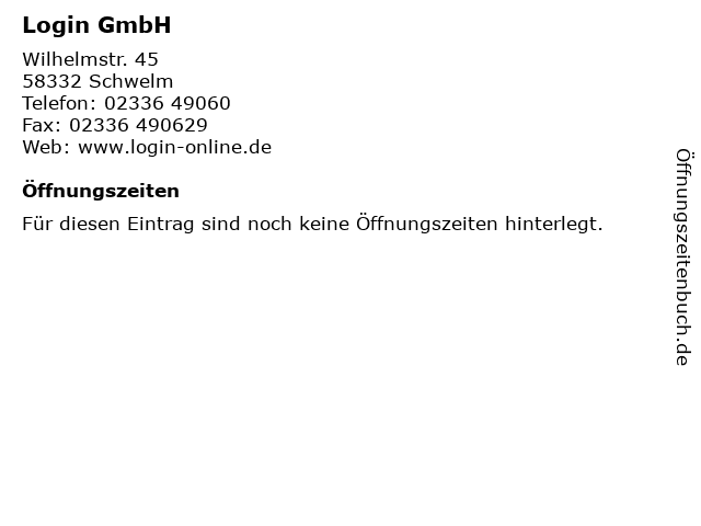 | Öffnungszeiten Login GmbH in Schwelm anzeigen | |