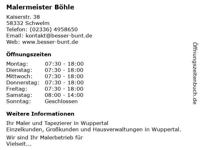 | Öffnungszeiten Malermeister Böhle in Schwelm anzeigen | |